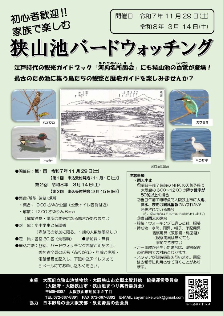 各回、バードウォッチング希望と明記の上、参加者全員の氏名(ふりがな)・年齢と住所・電話番号を記入し、sayamaike.walk@gmail.com あてEメールにてお申し込みください。