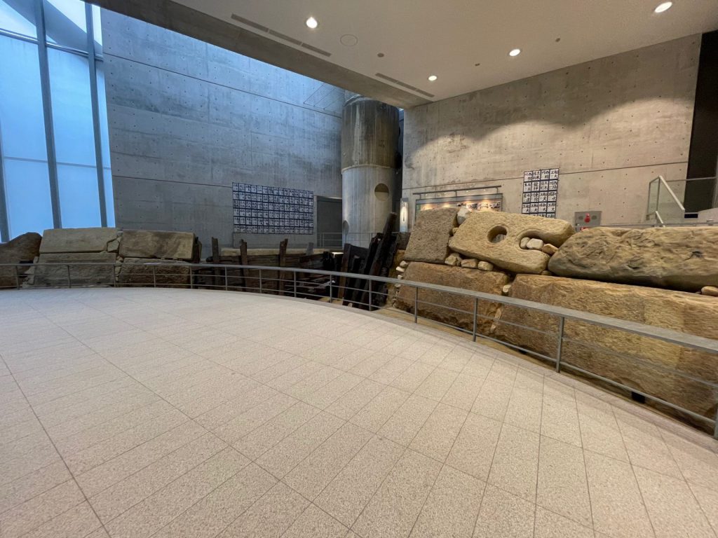 中樋の4段目からは、取水口の両側を護岸するために使われた巨大な石材が見つかりました。これは、古墳時代の石棺と「重源狭山池改修碑」(ともに国指定重要文化財)です。いずれも、鎌倉時代に重源が狭山池を改修した際に残したものでした。