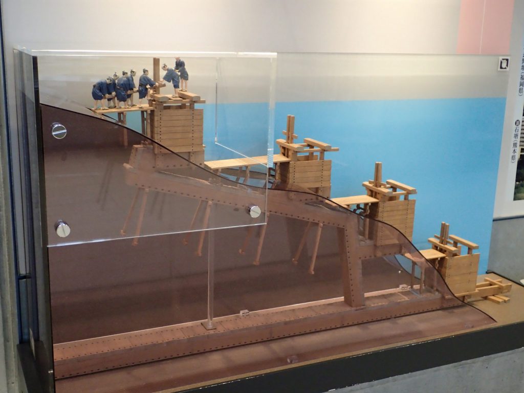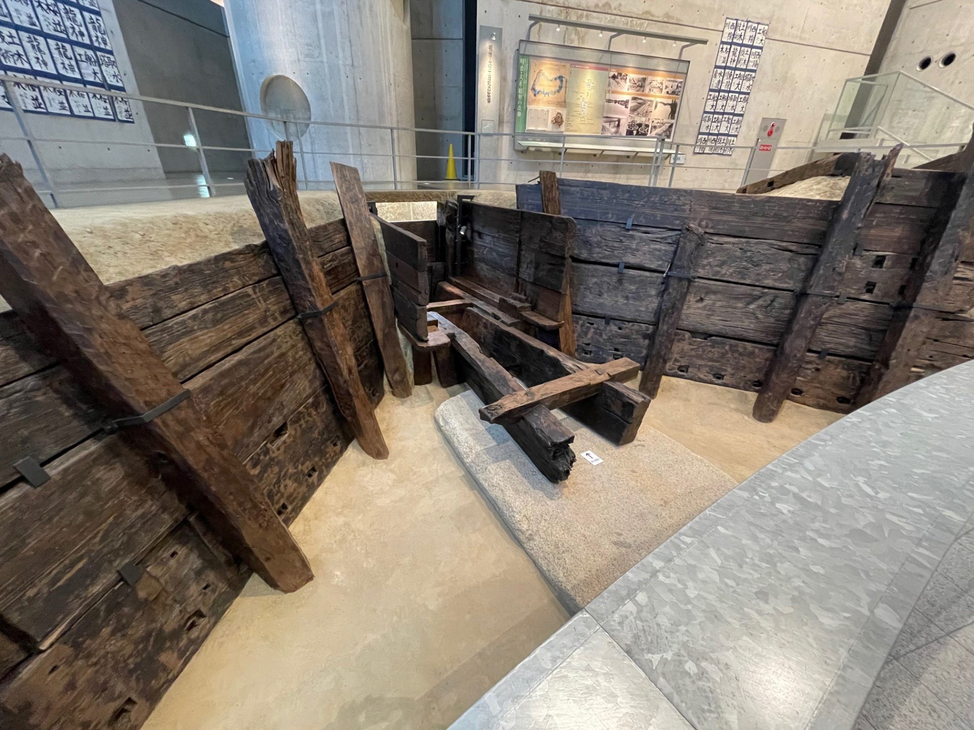 中樋は慶長13(1608)年、豊臣秀頼の命で片桐且元(かたぎりかつもと)が狭山池の大規模な改修を行った際に、改修されました。中樋と西樋は、確認されている中では国内最古となる尺八樋という形式の樋です。4段からなり、池の水位にあわせて取水口を選べるようになっています。このうち、上側の3段は大正~昭和の改修で撤去されてしまいましたが、最下段の4段目は池底に埋もれていたために残り、平成の改修で発見されることになりました。