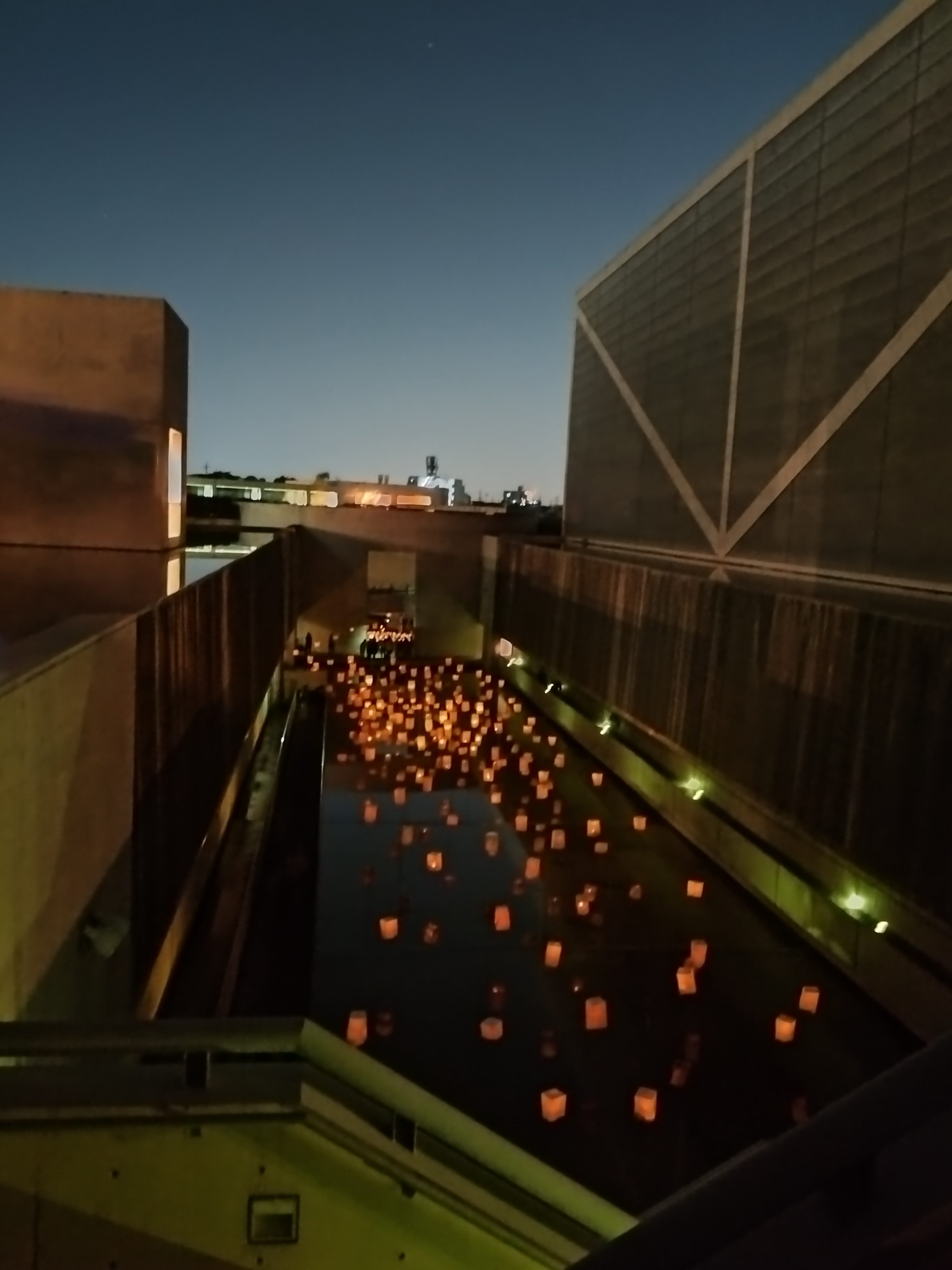 円形コートでゆらゆらあかりを灯したランタンの返却は今日限り。まだ残ってますよ!取りに来てね~。