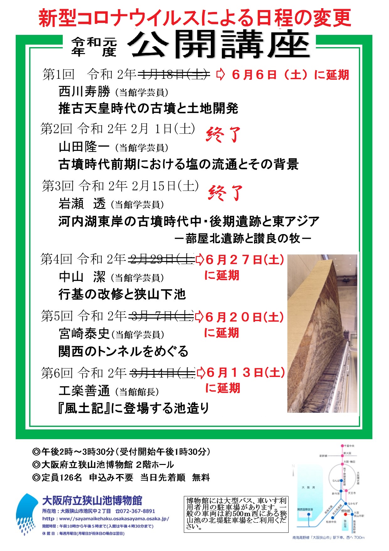 新型コロナウイルスのまん延防止の観点から状況によっては予定の変更または中止となる場合があります。H.P.などでご確認の上ご来館くださいますようお願いいたします。〈狭山池博物館ホームページはコチラ〉